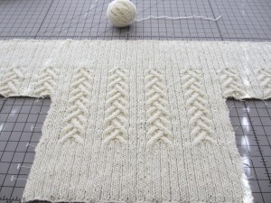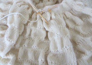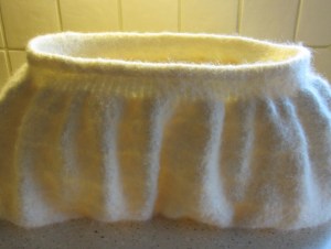 After following an industry pattern, knitorious was disappointed by the outcome. She began to turn the pages of her many knitting reference books and found the necessary information to achieve the effect that knitorious had mentally pictured in her mind. In order to achieve the sculptural qualities of ruching, the use of two different needle sizes (US 9 and 10-1/2), along with strategically placed increases and decreases were needed to sculpt rows of dimensional knitting. Three skeins (465 yds/skein) of Lion Brand’s (www.LionBrand.com) Fishermens’s Wool, Color 098 knit perfectly for the felting of knitorious’ ruched bag. After the fulling process, knitorious will post photographs.