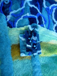 “Rain, rain go away come again another day.” I, knitorious want to agitate the fibers of wool roving into a beautiful piece of cloth. Welt felting requires a location conducive to the use of warm water, olive oil soap, bubble wrap and an abundance of manual labor. My backyard presents the perfect venue for such an undertaking. Between cloud cover, sprinkles and a light breeze, I proceeded to full some gorgeous turquoise blue and teal blue roving into a square. “Well…almost a square.” After the layers of roving began to full, pieces of yarn were added freeform. Rolling the sandwhich of roving and yarn between the layers of bubble wrap, the wool roving and yarn became one unique piece of fabric. After the fulling was complete, I rinsed the square in cool water. The piece of wool felt was left to dry for a couple of days. I began to cut and build layers creating a topographical element of peaks and valleys accented with beads and wool thread. What began as a two-dimensional piece of fabric metamorphosed into a three-dimensional sculpture.