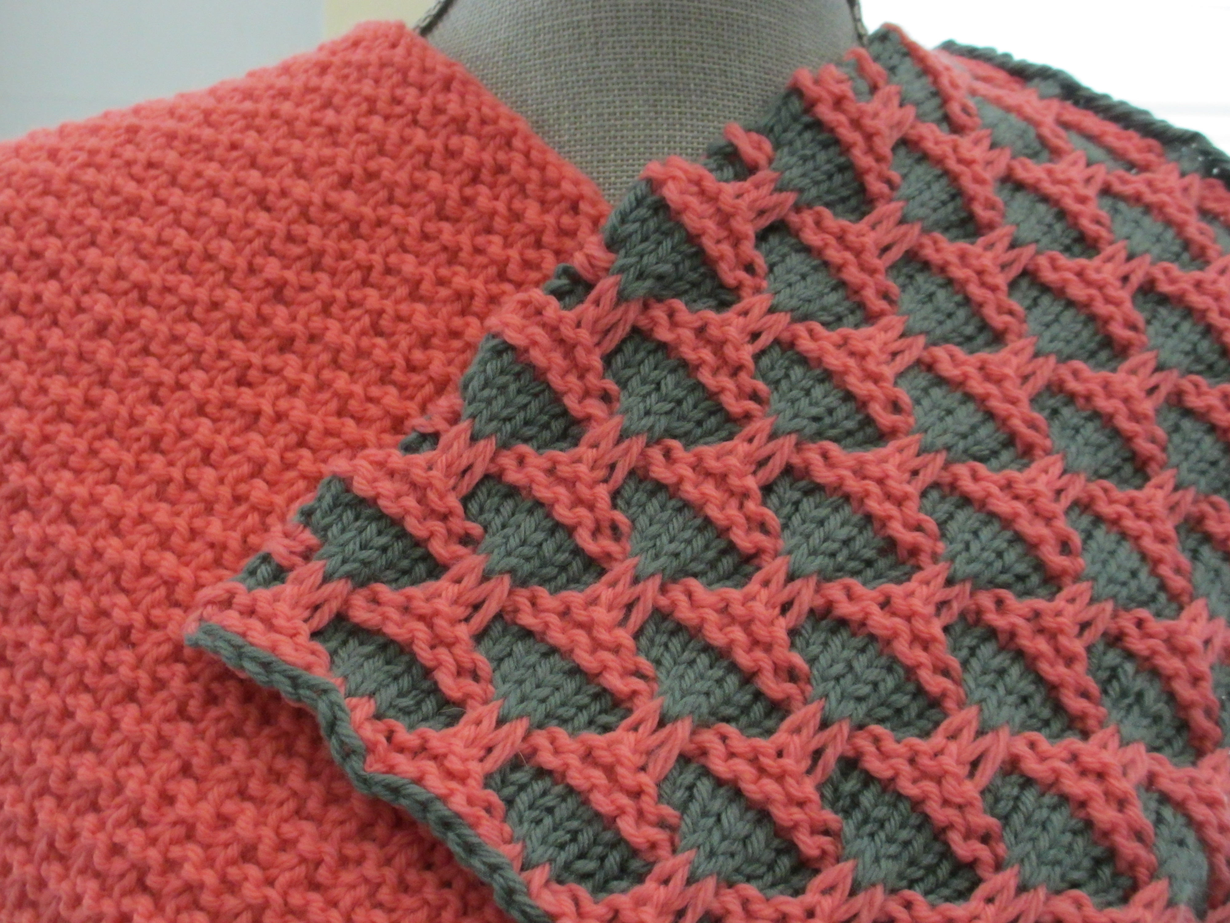 In order to visually create pattern and texture, I am fascinated with the dimensional effects offered by knit, purl and slip stitches. The textural quality of knit and purl stitches are unlimited. Mosaic patterns are formed by slipping stitches over rows giving an impression that two or more colors have been used in the same row. The Harmony Guides 250 Creative Knitting Stitches, Volume 4 and Mosaic Knitting by Barbara G. Walker have captured my attention.