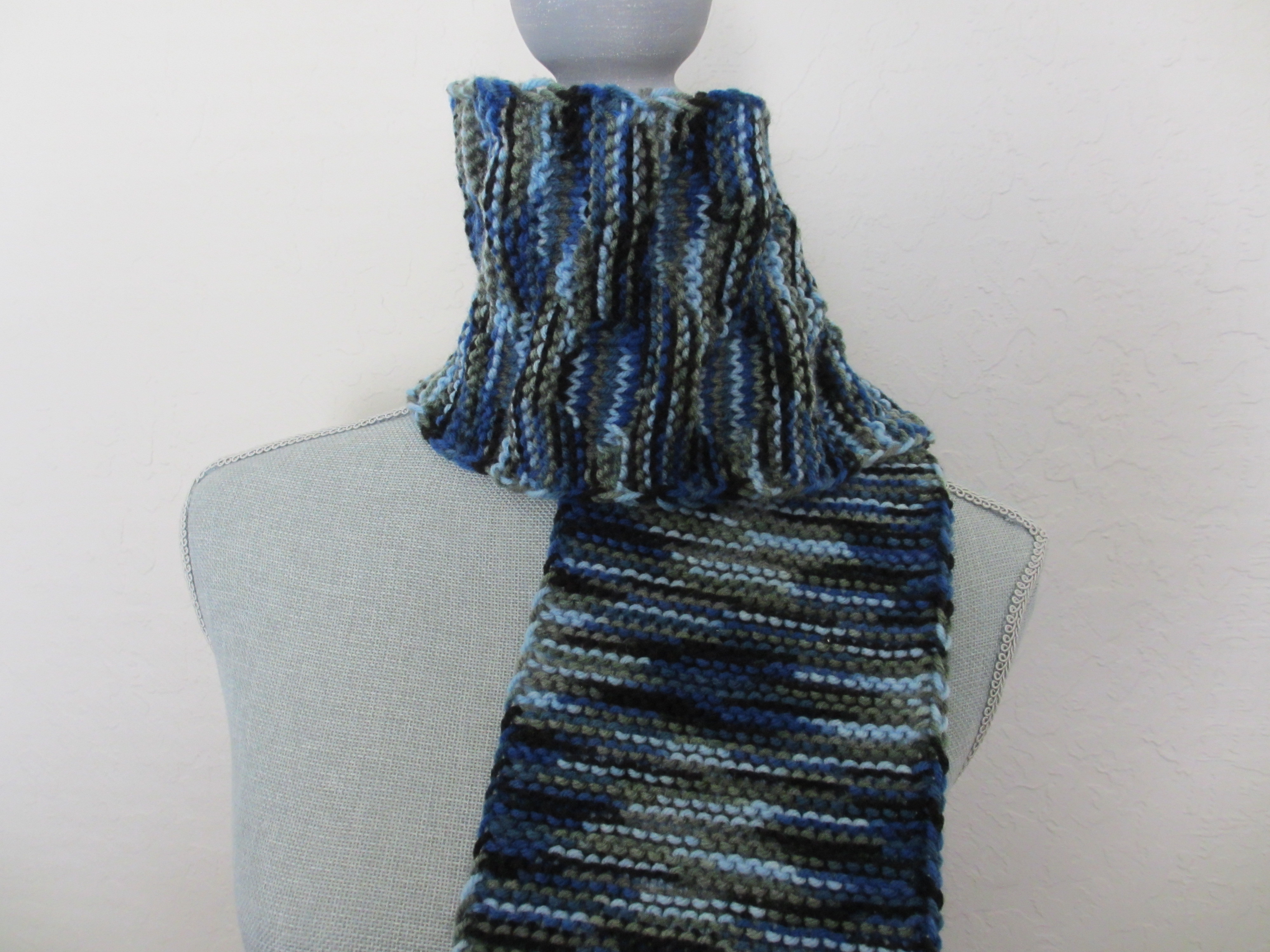 I wanted to explore both techniques, but not to the detail or attention given by these two artists/designers.  I was not after precision or perfection.  After purchasing a couple of skeins of Craftsmart yarn in Color #15 Twilight, row after row of garter stitch brought forth a motif reminiscent of IKAT weave.  After the second repeat of the motif on the scarf, I decided to isolate a color and purl the stitch, which changed the texture and patterning on the scarf.