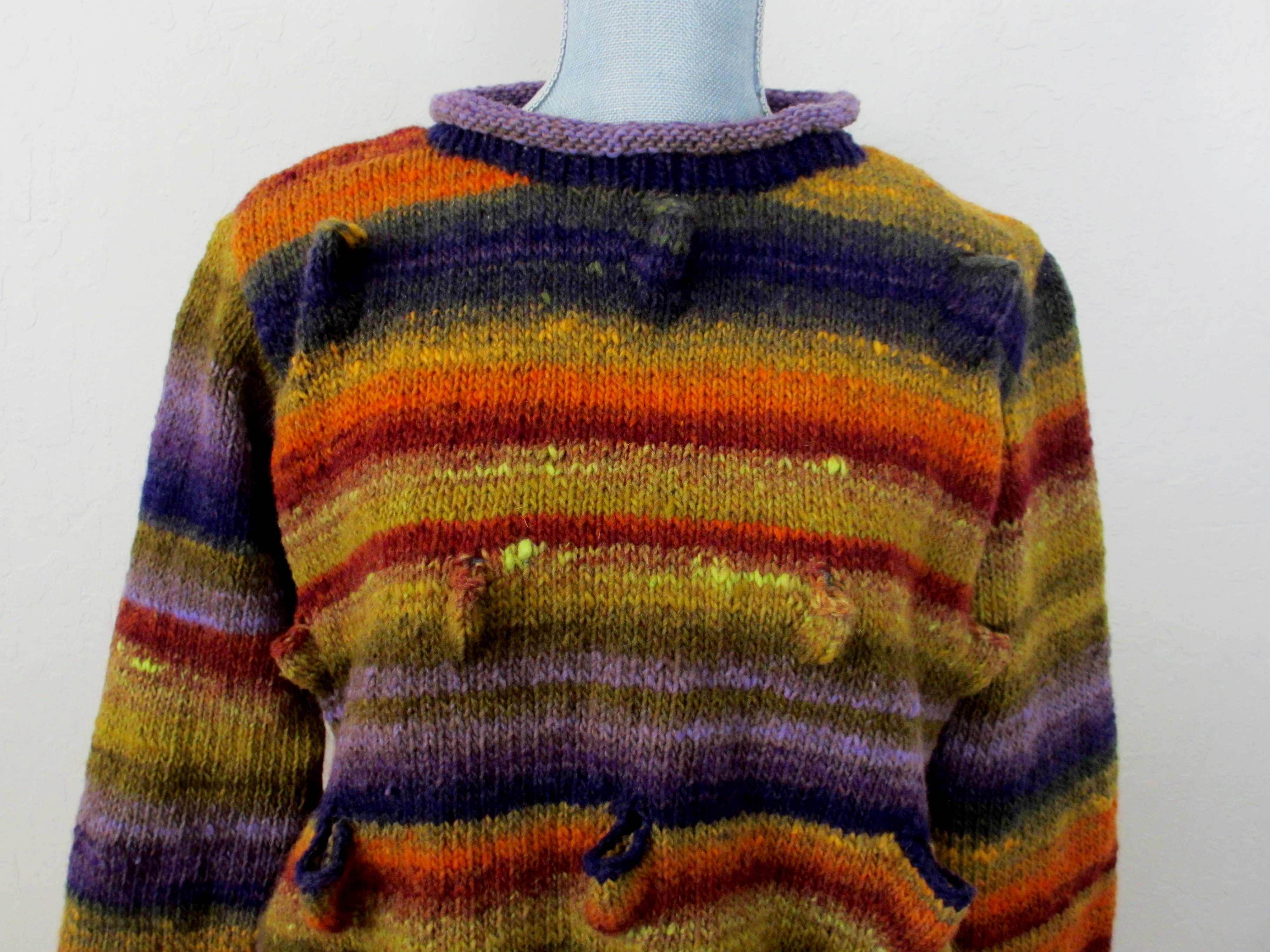 Next week, I plan on attending Stitches West 2013, wearing a new sweater knit using NORO Kuryeon Col. No. 185, Lot No. K.  The unique knitting pattern  is from NORO the World of nature, Vol. 15, Y-698.   In the process of organizing my knitting literature, I found buried treasure…Vol. 15.  I’ve kept this volume tucked away for atleast five years and was delighted to discover it all over again.   The act of casting off stitches creates pockets which render an interesting dimensionality to the surface of the sweater.  The sculptural qualities of the pattern are enhanced by the color gradations of the yarn.