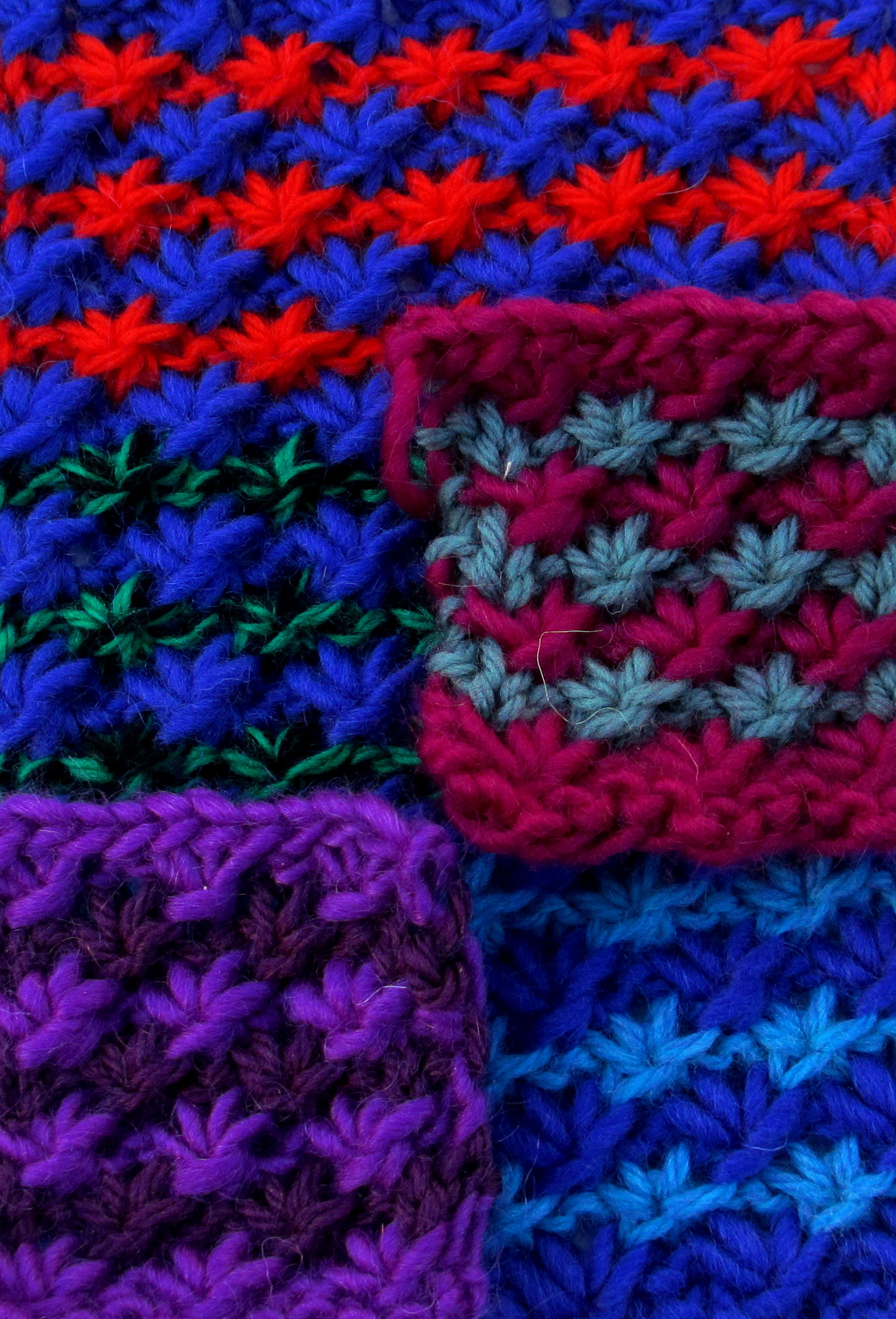 Scrumbling/freeform swatches provide an opportunity for experimentation with different color and stitch combinations. The “no rules” policy of freeform liberates the fiber artist from the “usual” to the “spontaneous.” Combining the culture of knitting and crochet exposes an abundance of shape and texture.