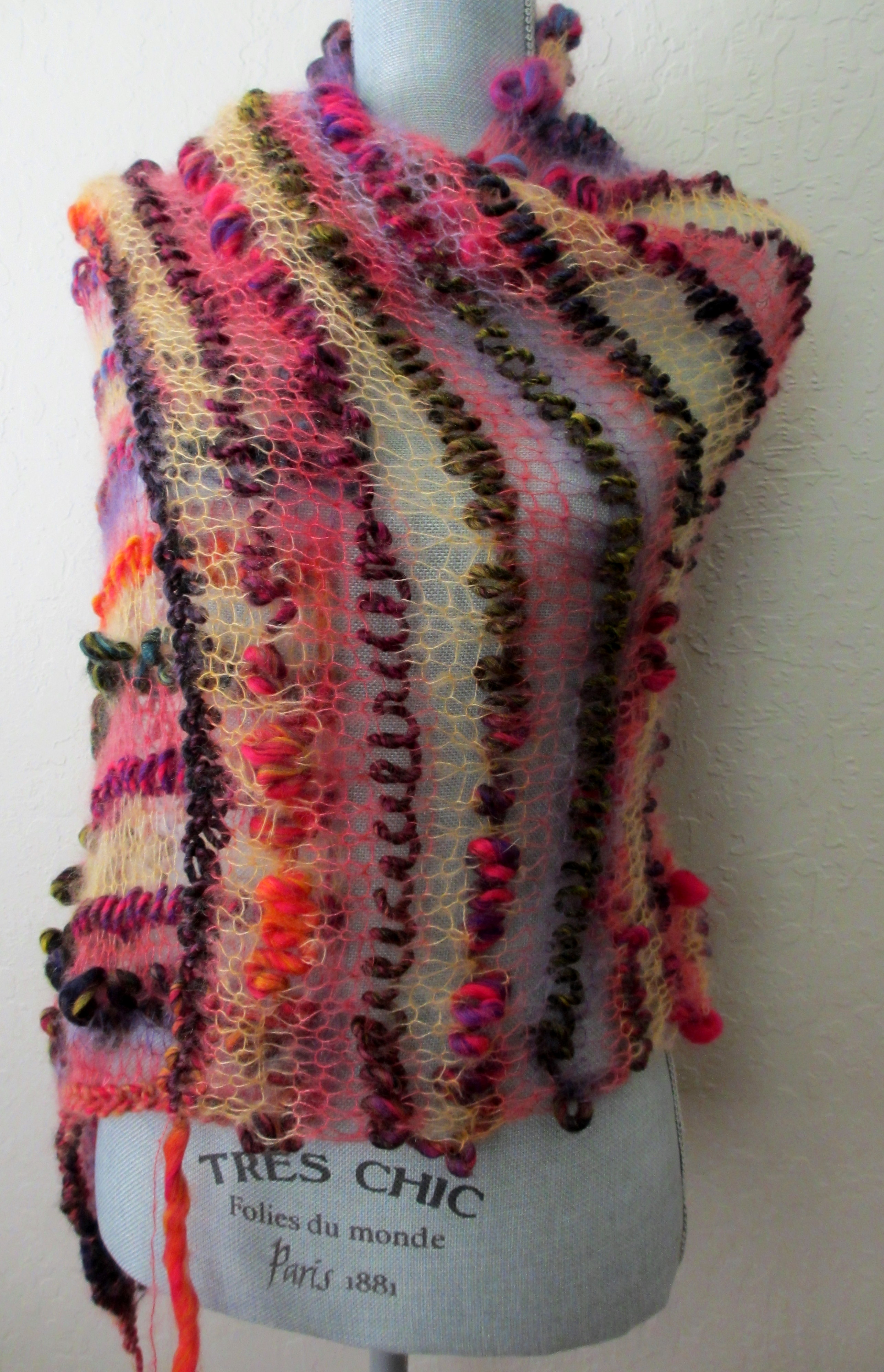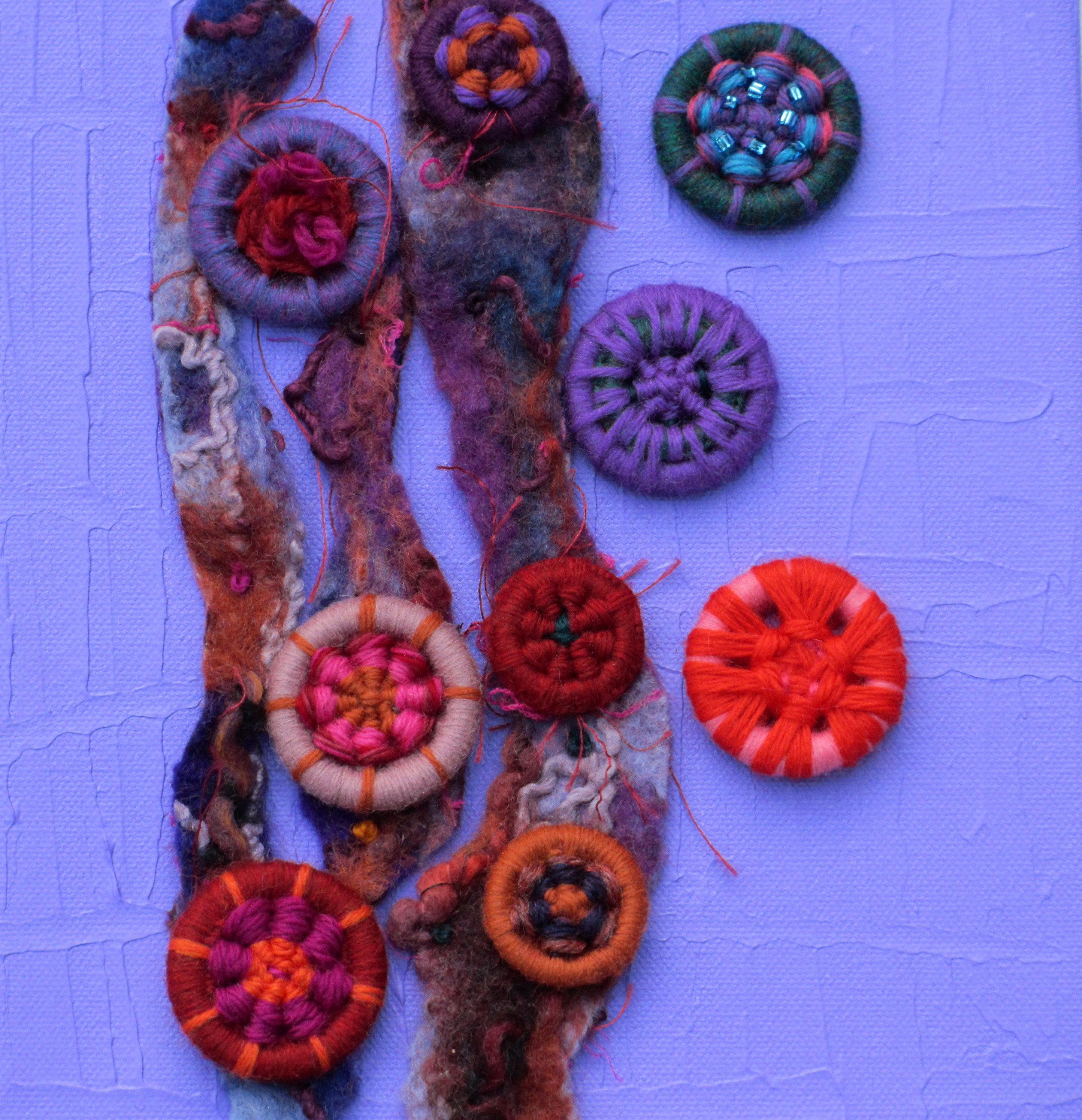 “Closure on Canvas” asks the viewer to consider the purpose of a button. The button as a utilitarian object as a fastener reflects modern fashion design. The focus of this three-dimensional piece of art considers the button as a handmade object of art, sewn to a substrate of hand felted wool, attached to a painted canvas using French knots. “Closure on Canvas” celebrates the individuality and uniqueness of handmade craft vs. industrial mass-produced items of today. The buttons are designed using worsted-weight wool yarn inspired by Dorset Buttons of the 1700s. The Dorset Crosswheel and Star Shirtwaister designs are the perfect vehicle for experimentation with color combinations and endless stitching possibilities. With each round of color, a rhythm develops enhancing a momentum of interest.