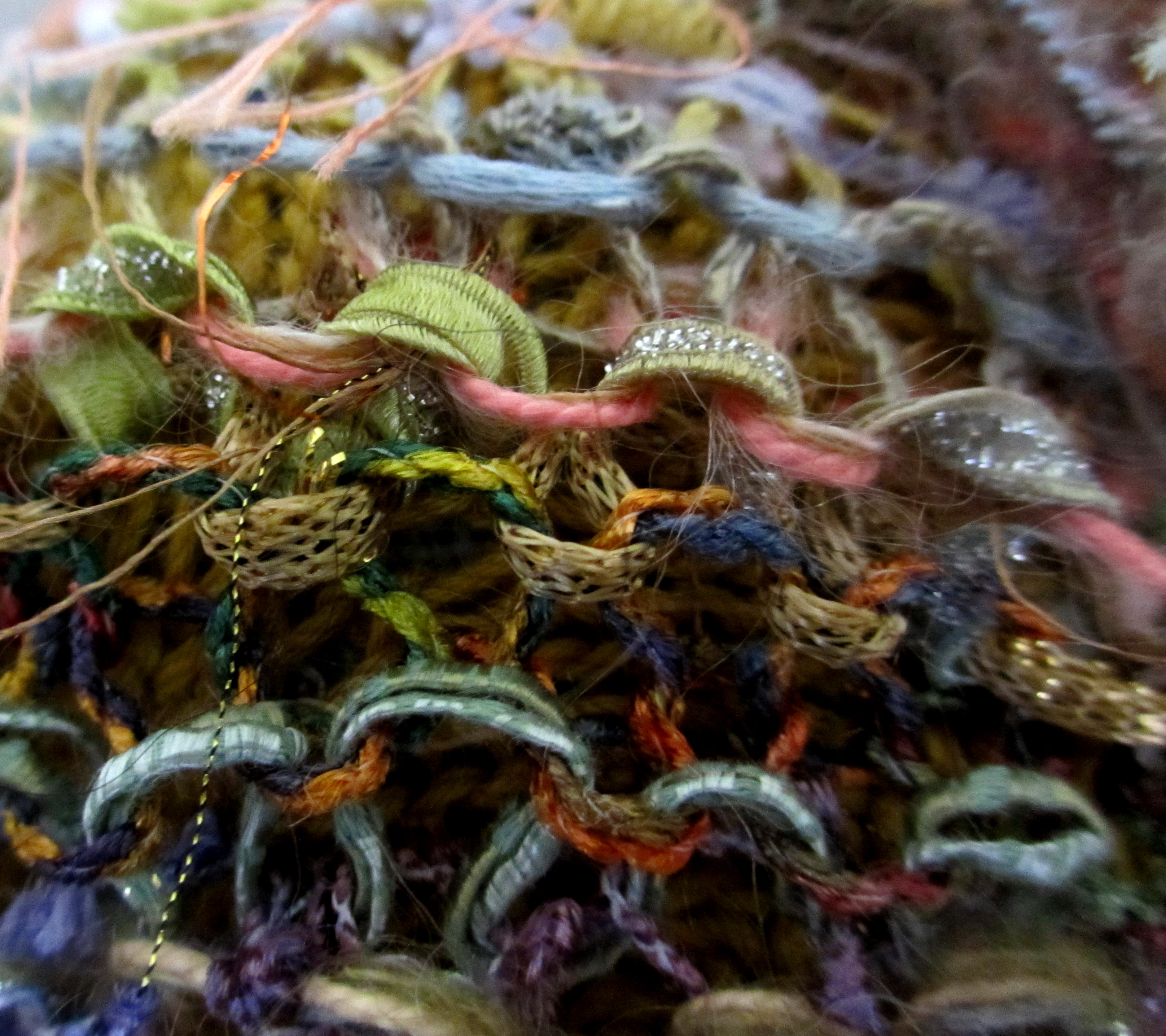 creates a beautiful subtle halo of color and softness, but combining novelty yarns together “knit as one” or with a natural fiber does not interest me. Yarns have their own fiber content, color and texture waiting to be transformed. Knit as individuals, different gauges and fiber content used in the same project creates a juxtaposition of weight and appearance which produces an interesting sculptural quality. In my personal opinion, combining yarns “knit as one” does not allow the individual yarn to speak for itself. Knit and crochet stitches translate for the yarn a language for all to see.