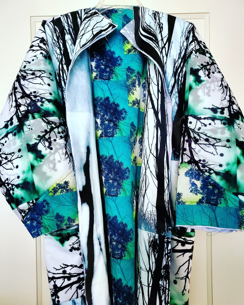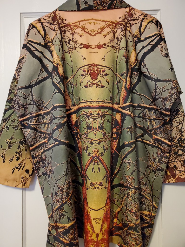 The first in the collection is a T-shaped coat featuring sticks-a-gogo Art Cloth Frosty Morning, Vintage Landscape and Ornaments On A Tree.